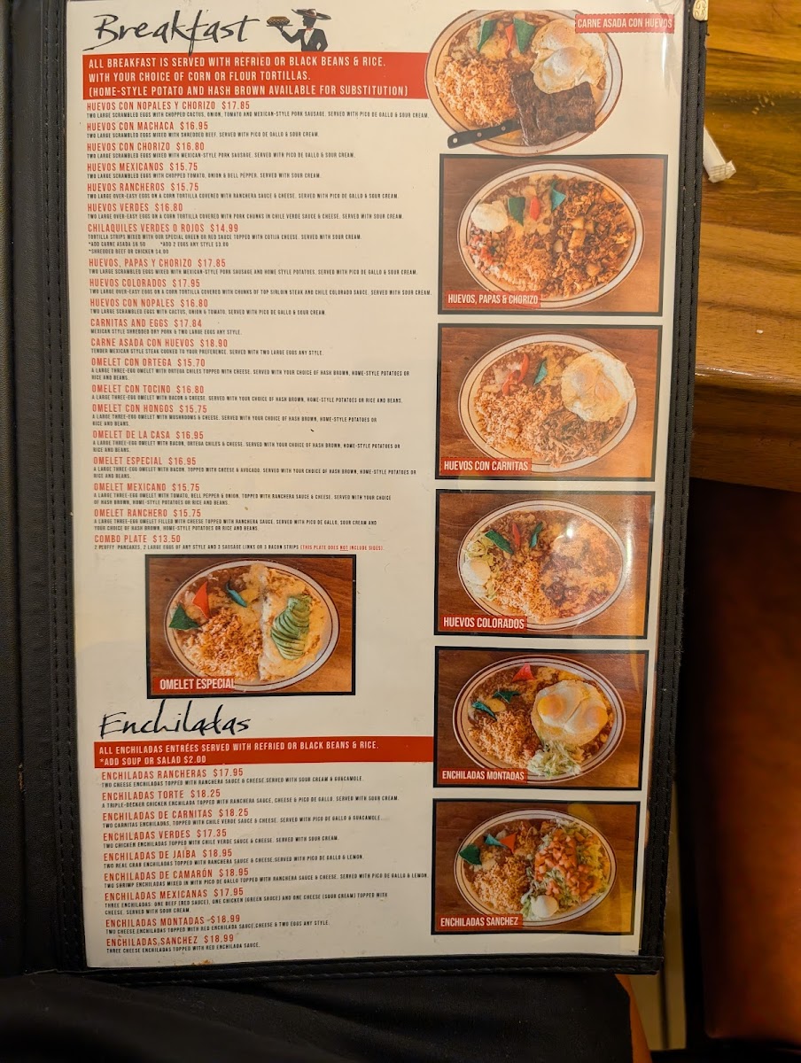 Two large eggs on a corn tortilla covered with ranchero sauce and metled cheese. Served with rice and beans or potatoes and your choice of tortillas or toast.