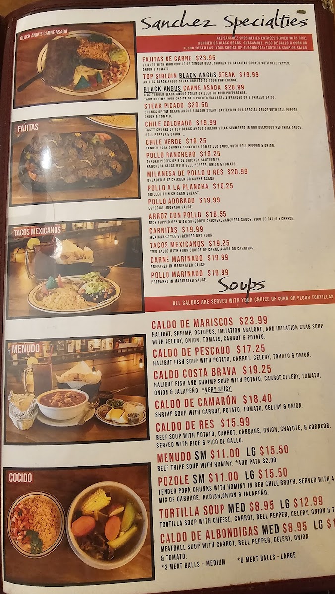 Chunks of top sirloin steak, sauteed in our special sauce with bell pepper, onion & tomato served with rice, beans, guacamole, pico de gallo, tortillas and Choice of either albondigas soup, tortilla soup or salad.
